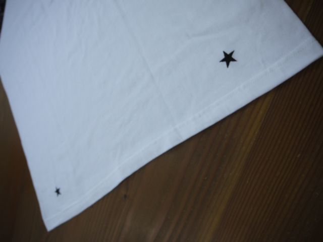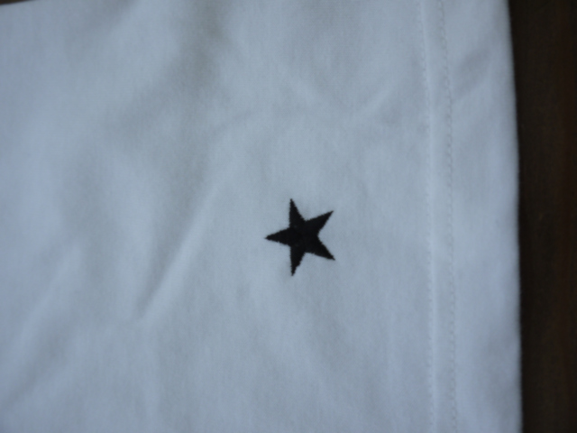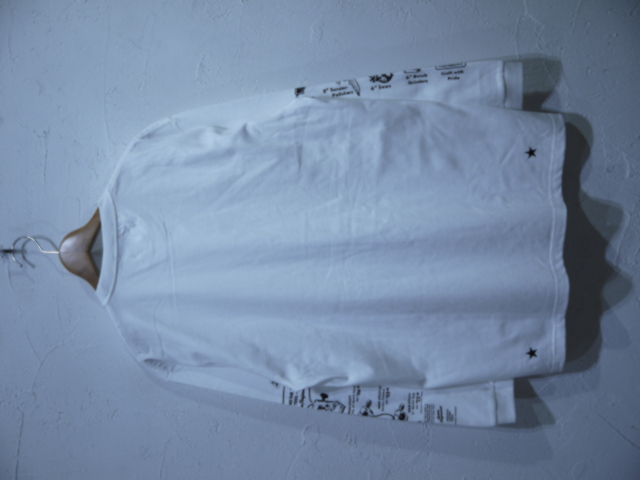 袖にはヴィンテージ広告をモチーフしたグラフィックをプリントし、左胸にはブランドロゴ、バック裾に★刺繍入り。